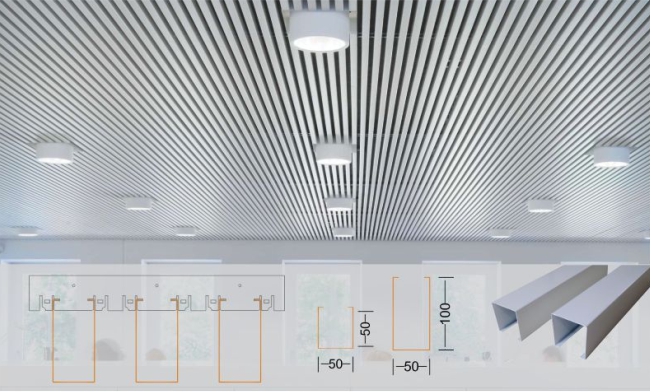 U-Shaped Baffle Open ceiling is featured by graceful and elegant line, and amazing curtain effect when installed in appropriate height and angle. Baffle Ceilings create unique room atmospheres. The free space between the baffles is optimally suitable for the integration of luminaries, sprinkler, smoke detectors, security systems and air conditioning or similar.